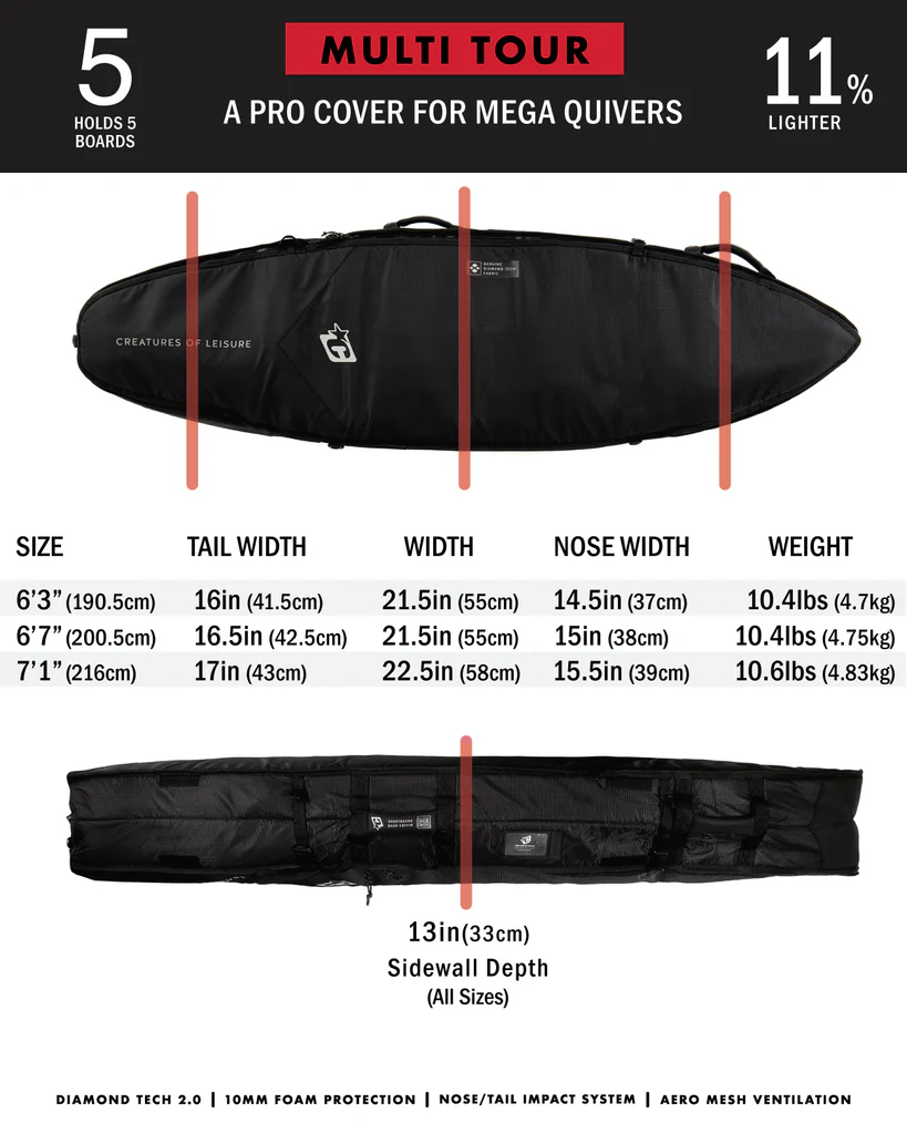 Protect your entire quiver of boards through multiple destinations with our Tour Cover. Everything is protected by 10mm FOAM and DIAMOND-TECH® fabrics, while compression straps hold your boards in place and keep things compact. Padded handles and shoulder straps make it comfortable to carry, plus a wide, flip lid opening lets you pack everything easily.Size: 6'7" Length 200,5 cm