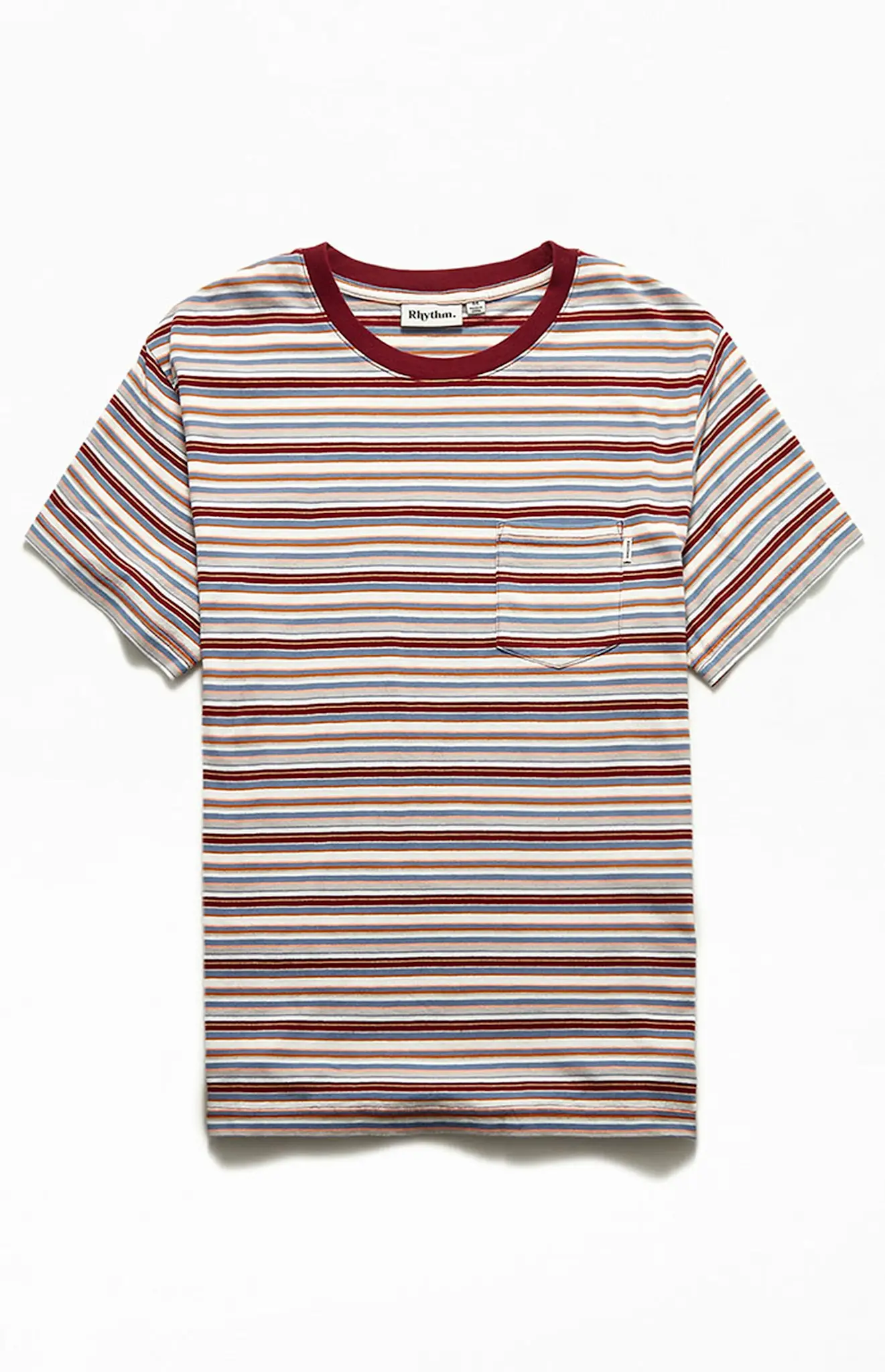 • The Rhythm Everyday Stripe tee, a short-sleeved t-shirt, with multi-coloured horizontal stripes, topped off with details placed on the upper left of the chest.