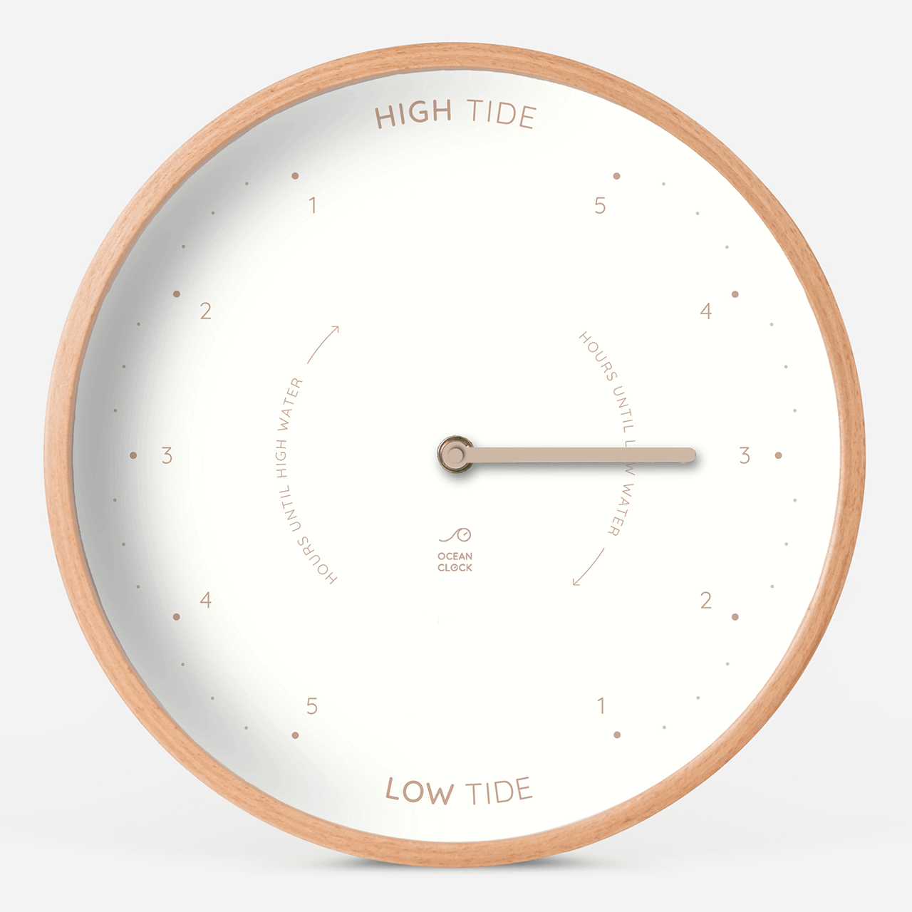 Made within our workshop in Hossegor (South-West of France), this tide clock is assembled meticulously by hand with quality materials: mineral glass, brass components, frame in natural beechwood, metal hand, silent quartz mechanism.